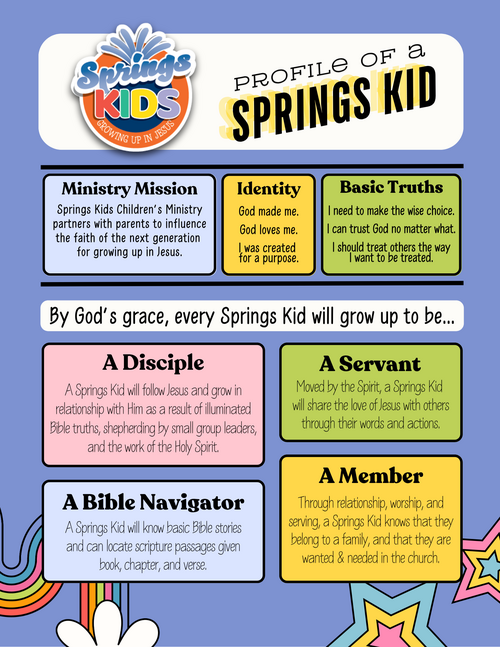 We're so glad to have your child joining us! Springs Kids Children's Ministry partners with parents to influence the faith of the next generation. God is using our team to spiritually grow and develop children so that in his timing they choose to begin a relationship with the Father through Jesus!